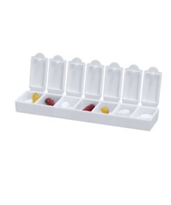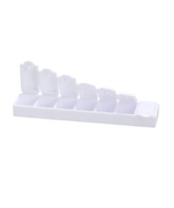 Wöchentlicher Pillenbehälter aus widerstandsfähigem PP in solider weißer Ausführung. Enthält 7 einzelne Fächer mit Sicherheitsverschluss. BPA-frei.