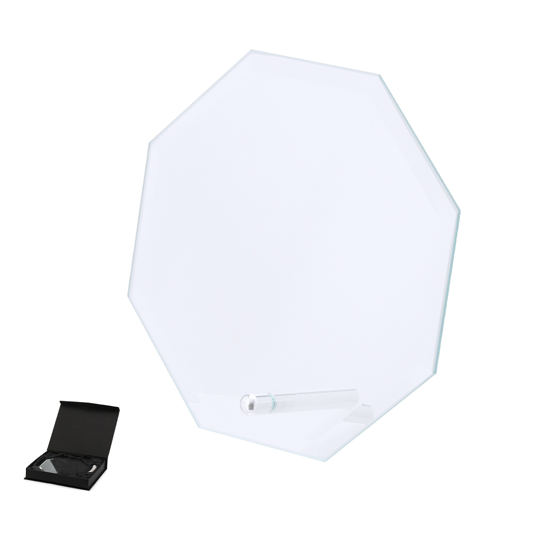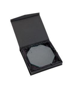 Trophäe aus dickem Glas mit elegantem achteckigem Design – speziell für den Laserdruck entwickelt. Präsentiert in einem individuellen Schutzcase.
