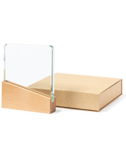 Gedenktafel aus dickem und widerstandsfähigem Glas mit einer Basis aus Naturholz. Wird in einer Schutzhülle aus Kraftpapier mit Magnetverschluss und Schaumstoff im Inneren geliefert.