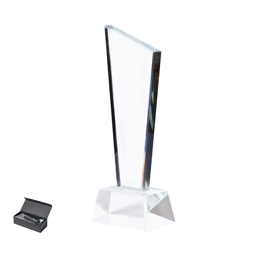 Trophäe aus dickem Glas mit exklusivem Design und widerstandsfähigem Sockel. Speziell für die Lasergravur entworfen und in einer Schutzhülle aus strapazierfähigem Karton mit Magnetverschluss und gestanztem Schaumstoff-Innenleben präsentiert.