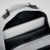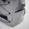 Rucksack aus reflektierendem 190T Polyester mit Schnürung auf der Vorderseite. 15“ Laptopfach. Seitliche Netztasche und Tasche mit Reißverschluss. Gepolsterter Rücken, Schultergurte und Boden.