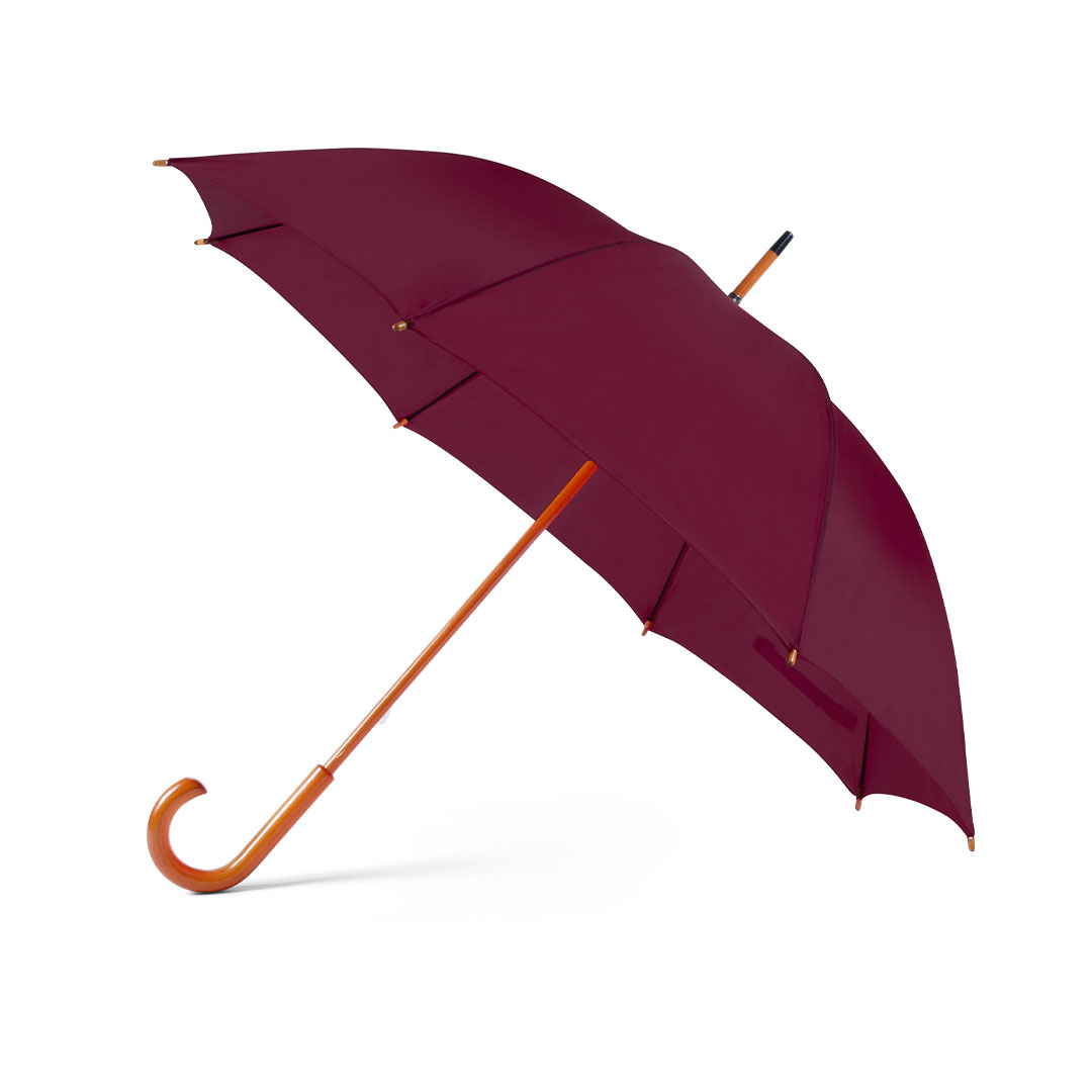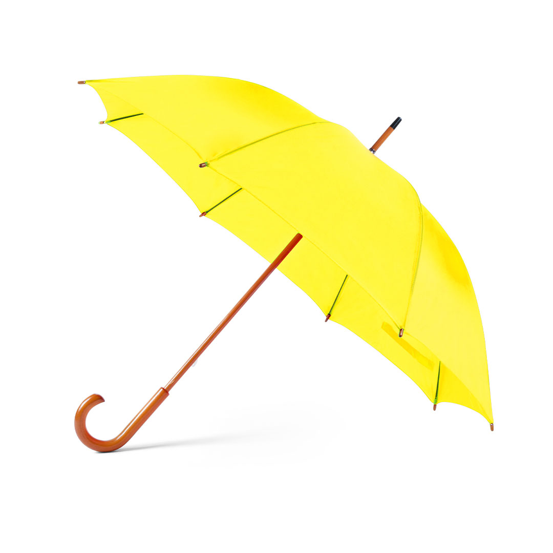 Regenschirm mit 8 Panelen aus Polyester. 105 cm Durchmesser, mit manueller Öffnung und schwarzen Metallstäben, Klettverschluss und geschmeidigem Holzgriff in Naturfarbe, in einer breiten Palette von leuchtenden Farben erhältlich.