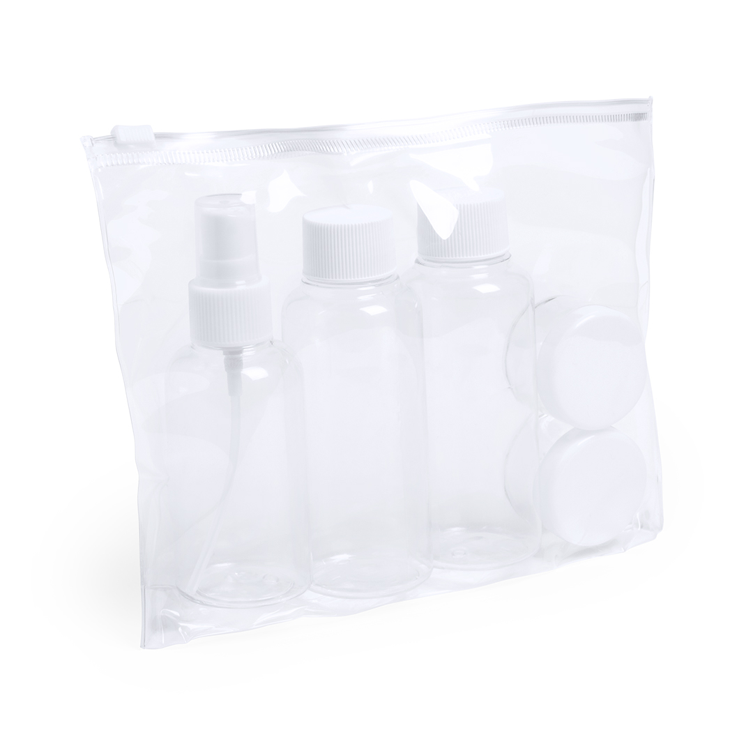 5-teiliges Reiseset mit transparentem Design. Enthält zwei Flaschen für Gel und Shampoo mit Schraubverschluss, Zerstäuber, zwei Töpfe für Creme. Präsentiert in einer PVC-Tasche mit Ziplock-Verschluss.