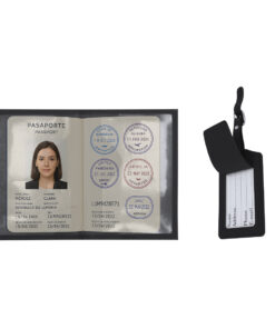 Reiseset bestehend aus Reisepasshülle und Kofferanhänger, hergestellt aus weichem PU. Reisepasshülle mit speziellem Fach für den Pass sowie zusätzlichem Kartenfach. Anhänger mit verstellbarem Riemen und silberner Schnalle, inklusive Einlegekarte mit ausfüllbaren Datenfeldern. Präsentiert in schwarzer Hülle.