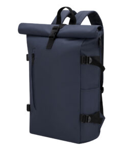 Rucksack aus weichem PU mit Rollverschluss mit Reißverschluss und Schnalle. Mit Fronttasche und Rücktasche mit seitlichem Zugang, beide mit unsichtbaren Reißverschlüssen, sowie zwei zusätzlichen Seitentaschen. Geräumiges Innenfach mit gepolstertem Fach für Laptops bis 15 Zoll. Verstellbare Seitengurte ermöglichen eine flexible Anpassung des Volumens. Schultergurte aus PU und gepolsterte Rückenpartie für höheren Komfort. Brustgurt mit Schnalle für sicheren Halt. Mit rückseitigem Band zur Befestigung am Trolley oder Koffer – ideal für Reisen und Pendeln.