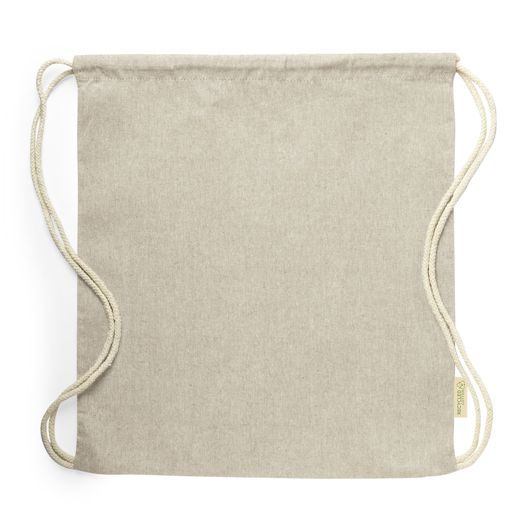 Linie Natur Rucksack mit Kordelzug aus recycelter Baumwolle 120 g/m2. Selbstschließende Kordeln aus Baumwolle, mit Öko-Label an der Seite und in einer breiten Palette von Naturfarben erhältlich. Belastbar bis zu 9 kg Gewicht.
