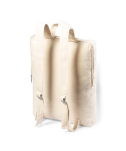 Rucksack der Linie Natur aus weichem Bio-Baumwollmaterial in natürlicher Farbe. Mit Reißverschlusstasche vorne, Tragegriff und verstellbaren Schulterriemen. Mit Bio-Logo auf dem Seitenetikett.