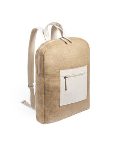 Mehrzweck-Rucksack aus Nature Line und zweifarbigem Design. Hergestellt aus Jute, mit Details aus Baumwolle. Hauptfach mit Reißverschluss und Doppelpuller, mit Reißverschlusstasche auf der Vorderseite zur einfachen Kennzeichnung und passenden verstellbaren Trägern.