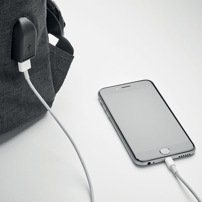 Rucksack mit 15“ Laptop-Fach und USB-Ladekabel. Magnetischer Schnappverschluss und Frontfach mit Reißverschluss. Gepolsterte Schultergurte. Zweifarbiger 600D Polyester.