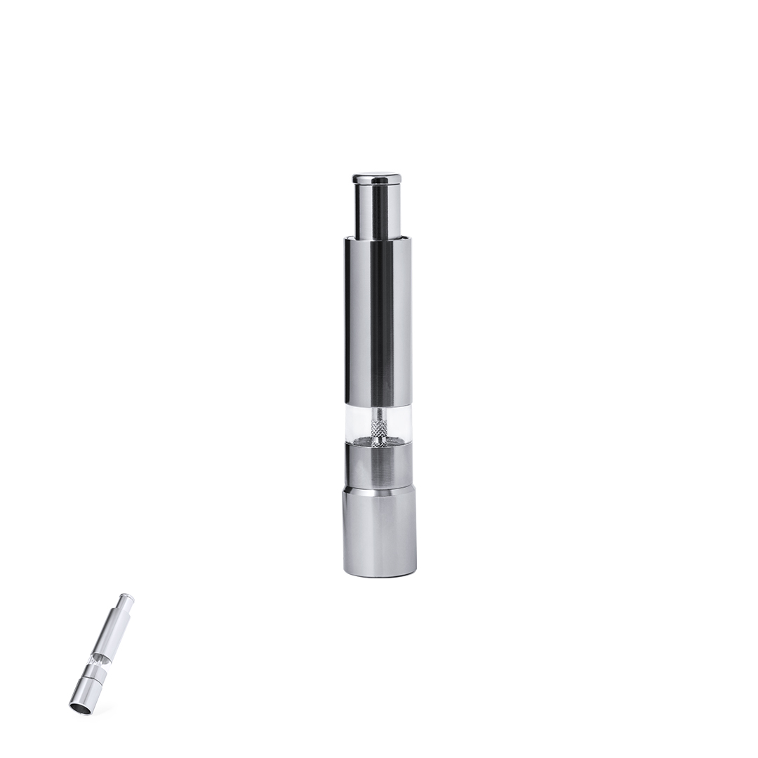 Manuelle Salz- und Pfeffermühle aus Aluminium. Ideal zum Hinzufügen der gewünschten Gewürze mithilfe der manuellen Druckknopfmühle. Mit einem Fenster zur Anzeige des Gewürzfüllstands. Präsentiert in einer Kraft-Design-Box.