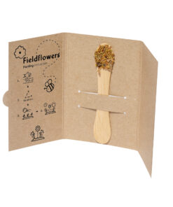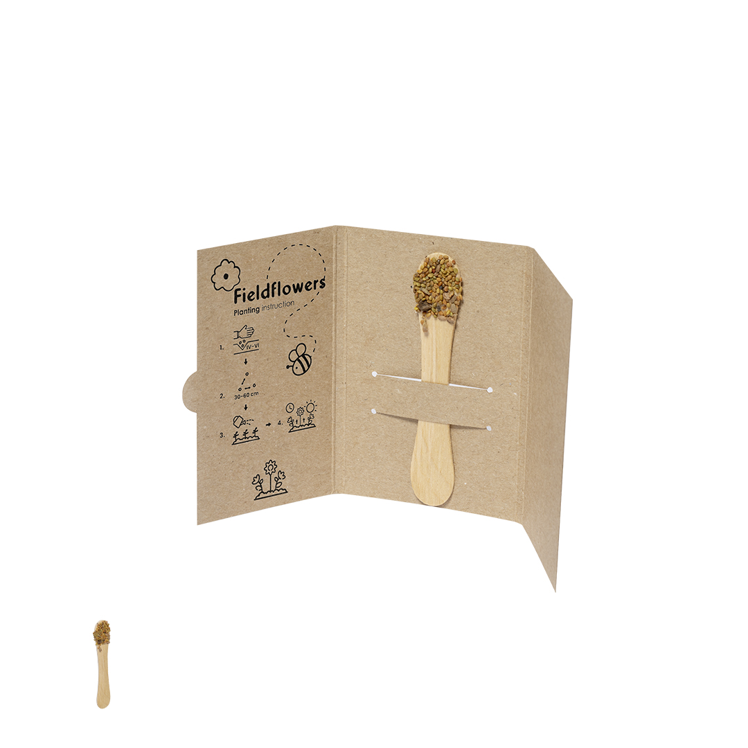 Bleiben Sie bei den Samen. An einem Ende befindet sich eine große Branding-Fläche und am anderen Ende befinden sich Wildblumensamen, die sofort gepflanzt werden können. Präsentiert in einer Recycling-Kartonkarte mit Pflanzanleitung.