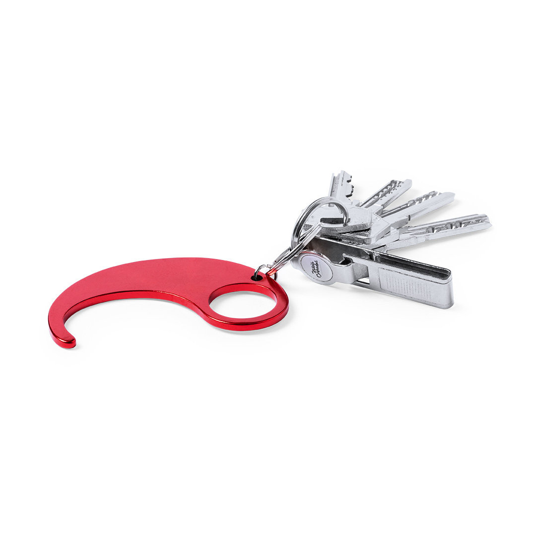 Hygienischer berührungssicherer Schlüsselring aus widerstandsfähigem Aluminium. Der einzige Schlüsselanhänger, der speziell für den Gebrauch in öffentlichen Verkehrsmitteln und zur Vermeidung des Berührens gemeinsamer Oberflächen mit den Händen (Türgriffe, Schalter, öffentliche Wasserhähne, Geldautomaten…) entwickelt wurde. Er verfügt über einen großen Markierungsbereich und bietet einen komfortablen Griff. Aluminiumoberfläche in hellen und vielfältigen Farben. Präsentiert in einer individuell gestalteten Tasche.