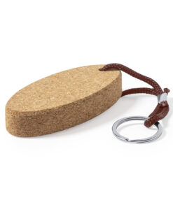 Schwimmender Schlüsselanhänger aus Naturkork, der die Verwendung natürlicher Materialien fördert und so zur Nachhaltigkeit des Planeten beiträgt. Mit Polyesterkordel und Metallring.