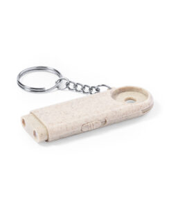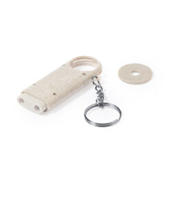 Münz-Schlüsselanhänger mit integrierter Taschenlampe, aus Weizenrohr und ABS. Mit praktischer Münze, 2 LEDs und Batteriebetrieb (Knopfbatterien enthalten). Mit Weizenstroh-Logo und in einer individuellen, recycelten Tasche.Hergestellt aus pflanzlichen Elementen, um die Verwendung natürlicher Rohstoffe zu fördern und die Schadstoffemissionen zu reduzieren.