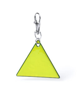 Schlüsselanhänger mit dreieckigem Design aus reflektierendem PVC mit hoher Sichtbarkeit und Karabiner zur Befestigung.
