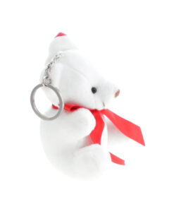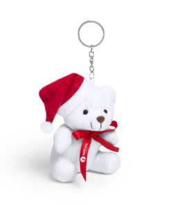 Teddybär-Schlüsselanhänger mit Weihnachtsmann-Hut und Schleife um den Hals.