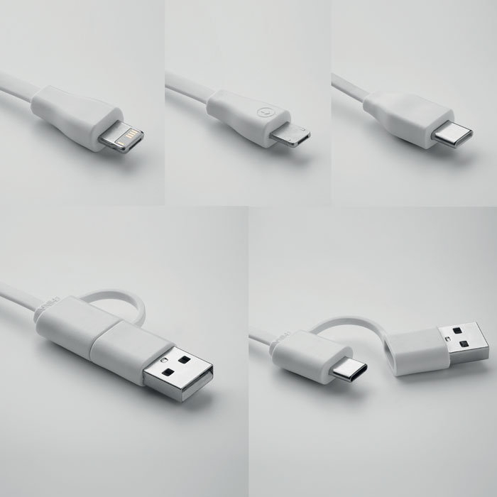 Schlüsselring mit Smartphone-Halter aus Bambus und Ladekabel. Eingang: 2-in-1 Typ-C & Typ-A. Ausgang: Typ-C und Mikro-B (2 in 1 Pin).