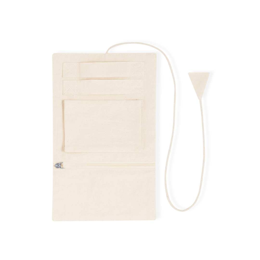 Faltbare Schmuckschatulle aus Baumwolle zur Aufbewahrung wertvoller persönlicher Gegenstände. In Naturfarbe, mit 3 verschiedenen Teilen: Oberteil mit Bändern, Mittelteil mit Tasche und Unterteil mit Reißverschlusstasche. Es lässt sich zusammenfalten und mit der passenden Kordel sicher halten.