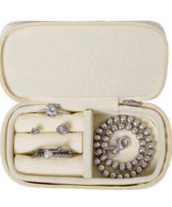 Schmuckkästchen aus PU-Leder. Natürliches Farbdesign mit Reißverschluss und zwei Innenfächern. Ein Fach in Form einer Schachtel und ein weiteres Fach mit Auflagen für Ringe und Ohrringe, ausgekleidet mit weichem Stoff. Präsentiert in einer individuellen Papiertüte.