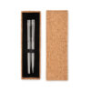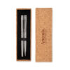 Schreibgeräte-Set mit Drehkugelschreiber (blaue Tinte) und Rollerball (schwarze Tinte) mit Schaft aus recyceltem Edelstahl. Lieferung in einer Schachtel mit Kork. Kork ist ein 100% natürliches Material. Aufgrund seiner strukturellen Beschaffenheit und Oberflächenporosität kann das endgültige Druckergebnis pro Artikel Abweichungen aufweisen.