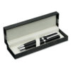 Schreibset aus Messing und Edelstahl in einer Geschenkbox. Drehkugelschreiber: blaue Tinte, Tintenroller schwarze Tinte.