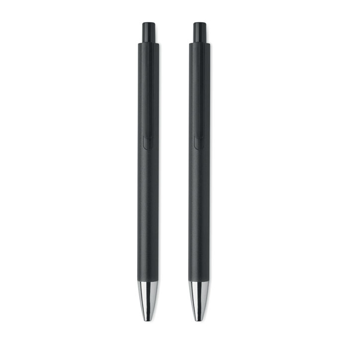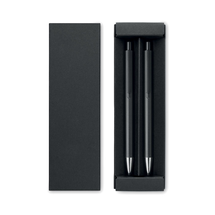 Schreibset aus recyceltem Aluminium. Bestehend aus 2 Kugelschreibern (1x blaue Tinte, 1x Graphitmiene). Präsentiert in einer Schachtel aus recyceltem Papier.