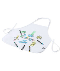 Schürze aus RPET-Vliesstoff in Weiß, speziell zum Ausmalen mit Buntstiften. Inklusive 5 Buntstiften in verschiedenen Farben. Mit verstellbaren Hals- und Hüftgurten. Außenetikett mit dem RPET-Kennzeichen. RPET-Material wird aus recyceltem Kunststoff hergestellt, um die Wiederverwendung von Kunststoffabfällen zu fördern und zur Nachhaltigkeit des Planeten beizutragen.