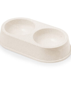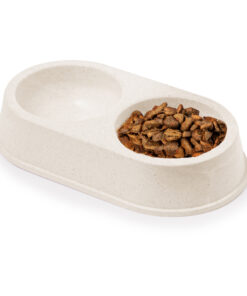 Futternapf mit zwei Fächern aus Bambusfaser. Ideal zum Füttern von Haustieren und mit zwei Fächern, eines für Feststoffe und eines für Flüssigkeiten. Präsentiert in einer einzelnen recycelten Tasche.
