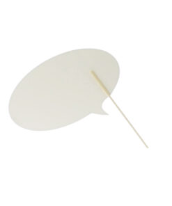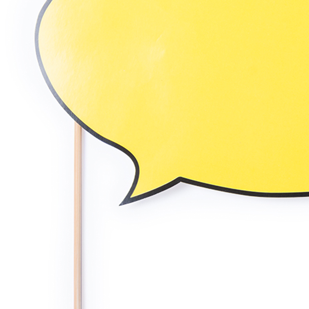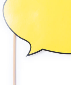 Selfie-Sprechblase in auffälligem Gelb mit großer Druckfläche. Hergestellt aus Pappe mit Holzgriff.