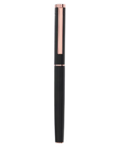 Unverwechselbares Kugelschreiber- und Rollerball-Set, beide mit eleganten mattschwarzen Aluminiumgehäusen und roségoldenen Zierelementen. Texturierte Grifffläche für einfachen Halt und Metallclip. Kugelschreiber mit Drehmechanismus und Rollerball mit Kappe, beide mit blauer Tinte und Jumbo-Patrone. Präsentiert in einem eleganten, schwarzen Etui in Lederoptik, weiß innen.