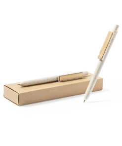 Linie „Natur“ Set aus Kugelschreiber und Druckbleistift. Hergestellt aus einer Kombination von Weizenstroh und Bambus-Clip, um die Verwendung von natürlichen Rohstoffen zu fördern und Schadstoffemissionen zu reduzieren. Clip mit breiter Brandingfläche. Inklusive Kugelschreiber mit blauer Tinte und Druckbleistift mit 2 x 0,5 mm Minen. Präsentiert in einer individuellen, recycelten Pappschachtel mit Weizenstroh-Logo auf der Oberseite von Kugelschreiber und Druckbleistift.