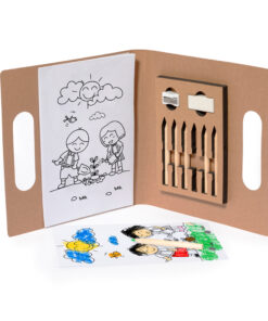 Malset aus recyceltem Karton. Inklusive einem verspielten Satz Zeichnungen und Buntstiften in einer praktischen Mappe mit Griffen. Inhalt: 20-Blatt-Block mit Naturzeichnungen zum Ausmalen. Box mit 6 Holzstiften in verschiedenen Farben. Anspitzer. Radiergummi.