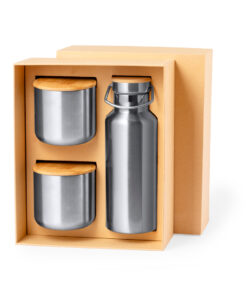 Praktische Thermoskanne und Becher aus Edelstahl. Inklusive 500ml Edelstahl Thermoskanne mit Bambus Detail auf der Oberseite und am Griff. Darüber hinaus enthält es 2 Becher mit je 300 ml Fassungsvermögen, aus Edelstahl, mit Deckel aus Bambus und Push-on-Verschluss. Präsentiert in einer Kraft-Design-Box mit ausstanzungen.