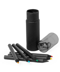Set mit 6 Holzstiften in schwarzer Farbe, mit sechseckigem Schaft und Minen in verschiedenen Farben. Präsentiert in einer zylindrischen Box aus schwarzem Recycling-Karton, mit passender transparenter Haube und integriertem Bleistiftspitzer.