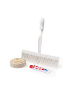 Unverzichtbares Pflegeset mit Zahnbürste, Zahnpasta, Kamm und Seife. Inhalt:Zahnbürste und Kamm aus Weizenstroh, wodurch die Verwendung natürlicher Rohstoffe gefördert und Schadstoffemissionen reduziert werden.Zahnpasta in der 6 g Tube mit Schraubverschluss.20 g Seifenstück.Das Set wird in einer individuellen Design-Kraftbox präsentiert.