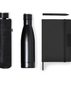 Elegantes Premium-Set, bestehend aus:Doppellagige Thermoskanne aus recyceltem Edelstahl mit mattschwarzem Finish und 500 ml Fassungsvermögen, mit stabilem, matt-silberfarbenem Metallgriff. Mit Edelstahl-PlaketteRPET-Notizblock in elegantem Schwarz, mit speziellen Metalldetails für die Laserbeschriftung. Mit elastischem Verschluss und Lesezeichen aus Stoff. Innen mit 80 Blatt einfarbigem Layout. Mit RPET-LogoFaltbarer Regenschirm in Schwarz mit einem Durchmesser von 98 cm. Hergestellt aus 190T RPET-Pongee-Material. Manuelle Öffnung, mit Anti-Wind-System und Fiberglas-Rippen. Mit Tragetasche und passenden Bändern. Mit unverwechselbarem RPET-Etikett.Kugelschreiber aus RPET mit mattschwarzem Finish, Drehmechanismus und blauer Tinte. Präsentiert in einem individuellen, mattschwarzen Etui mit einer Innenstanzung für jedes Element des Sets.Das RPET-Material wird aus recyceltem Kunststoff hergestellt, wodurch die Wiederverwendung von Kunststoffabfällen gefördert und ein Beitrag zur Nachhaltigkeit unseres Planeten geleistet wird.
