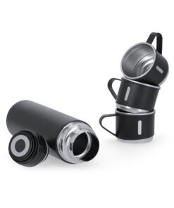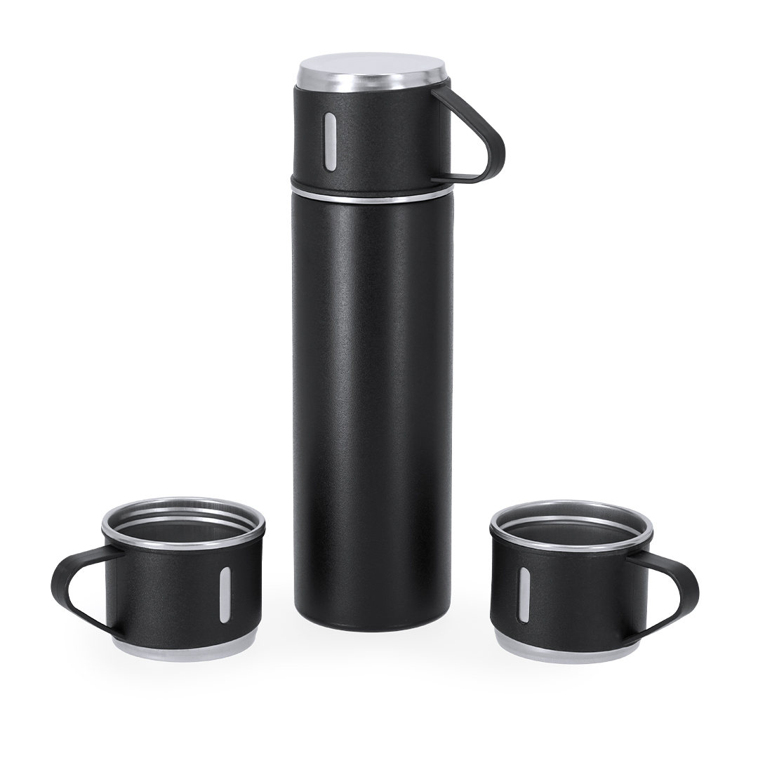 Set aus Thermosflasche und 3 Tassen aus Edelstahl. Doppelwandige Thermosflasche mit 420 ml Fassungsvermögen, die eine bessere und länger anhaltende Temperaturerhaltung gewährleistet, mit Sicherheitsausgießer. 140 ml Schraubbecher mit elegantem schwarzen Design, ideal für heiße oder kalte Getränke, jederzeit und überall. Präsentiert in einem eleganten schwarzen Etui.