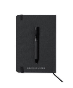 Set aus Notizblock und Stift von Antonio Miró. Enthält:Notizblock in elegantem Schwarz, aus strapazierfähigem 300D-Polyester, mit festem Umschlag und passendem Gummizug. Innenseite mit 100 linierten Blättern.Kugelschreiber aus Metall mit Drehmechanik und blauschreibender Tinte. Mit schwarzem Schaft und Zierleiste, Metallclip und Markenlogo.Das Set wird in einer eleganten und stabilen schwarzen Einzelschachtel mit Antonio Miró-Logo und passender Schutzhülle präsentiert.
