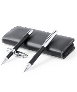 Hochwertiges Kugelschreiber- und Rollerpenset. Hergestellt aus einer eleganten Kombination aus schwarzem PU und verchromtem Metall. Kugelschreiber mit Drehmechanik und blauschreibender Jumbo-Patrone. Rollerpen mit Kappe und Gel-Tinte in Blau, Jumbo-Patrone. Präsentiert in individuellem PU-Etui mit Reißverschluss und passendem Innenleben mit einzelnen Fächern.