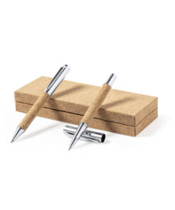 Linie „Natur“ Kugelschreiber- und Rollerpenset. Hergestellt aus einer Kombination von Naturkork und Metall, um die Verwendung von natürlichen Rohstoffen zu fördern und Schadstoffemissionen zu reduzieren. Kugelschreiber mit Drehmechanik in blauer Tinte. Rollerpen mit Kappe und Gel-Tinte in Blau, mit Metall-Jumbo-Patrone. Präsentiert in einem individuellen Korketui mit Wildlederinnenseite.