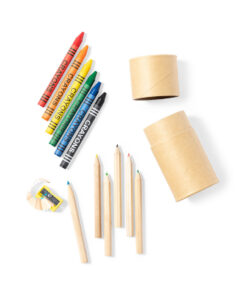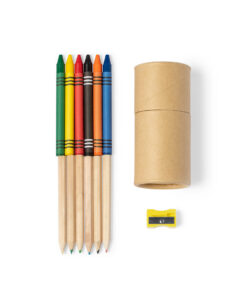 13-teiliges Set in zylinderförmigem Etui aus Naturkarton. Beinhaltet 6 hölzerne Buntstifte mit sechseckigem Körper in Naturfarbe und Minen in verschiedenen Farben sowie Anspitzer in Gelb und 6 zylinderförmige Wachsmalstifte in verschiedenen lebendigen Farben.