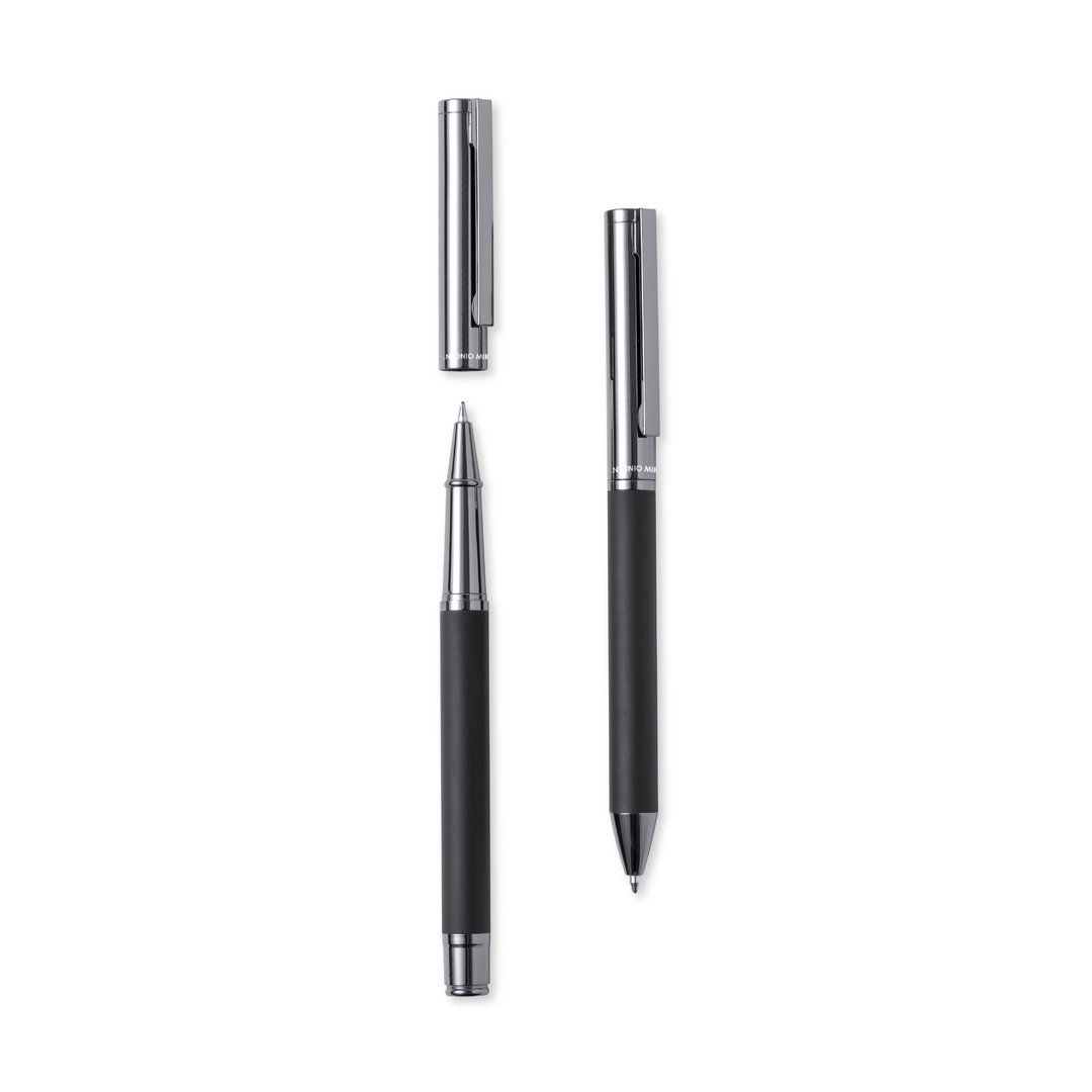Antonio Miró Kugelschreiber- und Rollerball-Set. Enthält:Kugelschreiber aus Metall mit mattschwarzem Schaft. Verchromte Beschläge und Kappe mit Markenlogo Jumbo-Patrone und blauschreibender Tinte.Metallischer Tintenroller mit mattschwarzem Schaft. Verchromte Beschläge und Kappe mit Markenlogo. Jumbo-Patrone und blauschreibender Tinte.Präsentiert in einem eleganten und widerstandsfähigen schwarzen Einzeletui mit Antonio-Miro-Logo, Magnetverschluss und passender Schutzhülle.