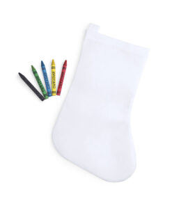 Non-Woven-Weihnachtssocke aus Faservlies in Weiß. Speziell entwickelt für das Bemalen mit Wachsmalstiften. Enthält 5 zylinderförmige Wachsmalstifte in verschiedenen Farben. Mit Schlaufe zum Aufhängen und hitzeversiegelter Oberfläche.