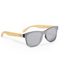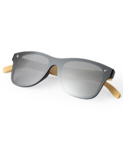 Sonnenbrille der Liene „Natur“ mit UV400-Schutz. Schwarzer Rahmen aus widerstandsfähigem PC-Material, mit Spiegeleffektgläsern und Bügel aus natürlichem Bambus. Präsentiert in einem attraktiven Etui im Öko-Design.