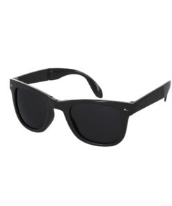 Faltbare Sonnenbrille mit UV400-Schutz, gefertigt aus recyceltem PC. Widerstandsfähiger Rahmen mit elegantem Design und glänzendem Finish in Schwarz. Die Gläser sind schwarz, um Stil zu garantieren. In einem weißen, runden Etui mit Reißverschluss verpackt.