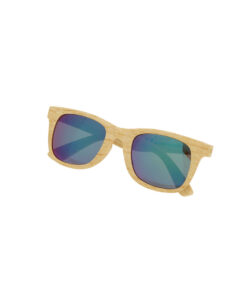 Sonnenbrille mit Holzstil Rahmen. Mit grün verspiegelten Linsen und UV400 Schutz.