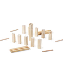 Ahnen-Kubb-Spiel aus widerstandsfähigem, natürlichem Kiefernholz. Set mit 21 Teilen, in einer Tragetasche aus Baumwolle mit passendem Kordelzug. Präsentiert in einer individuellen Box im Kraftpapier-Design, mit Bedienungsanleitung in Englisch und Spanisch.