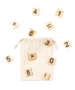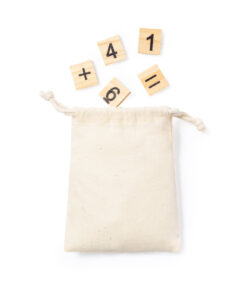Rechenset aus widerstandsfähigem, natürlichem Kiefernholz. Set mit 32 Teilen in einer Tragetasche aus Baumwolle mit passenden Kordeln.