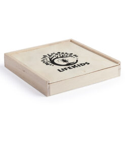 Sets aus verschiedenen Holzspielen: Mikado, Schach, Dame und Domino. Präsentiert in einer Holzkiste mit Schiebedeckel. Brett mit glatter Seite für die Personalisierung.