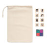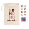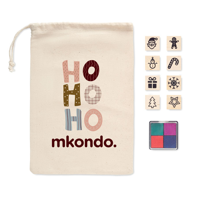Set mit 8 Stempeln aus Holz mit weihnachtlichen Motiven und 4-farbigem Stempelkissen. Lieferung im Baumwollbeutel mit Kordelzug.